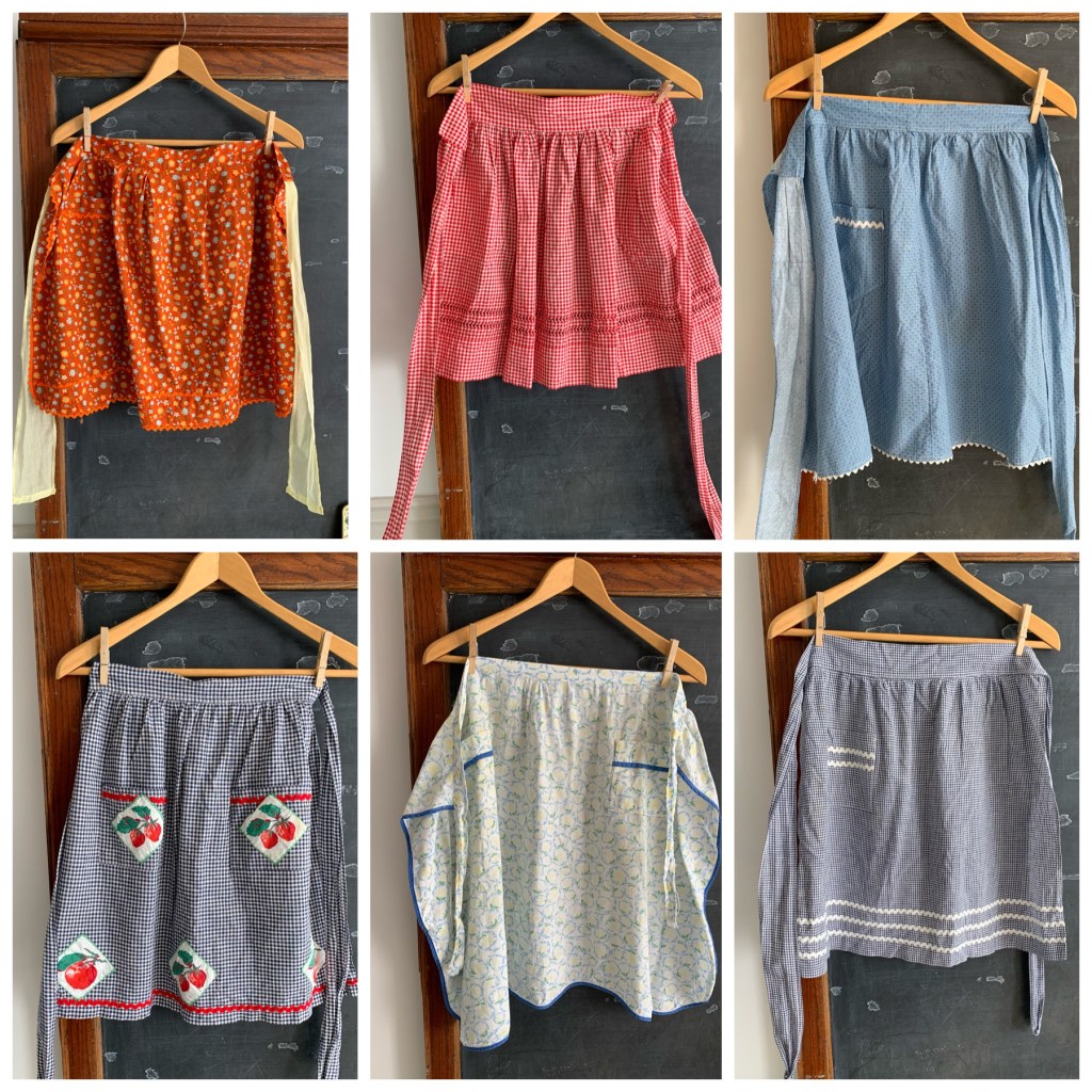 As the years have passed, I totally get it now. Browsing antique malls and thrift stores soon became a pastime I adored. Feeling transported to other times, and seeing items that had well worn edges was like a warm hug. From time to time a little apron would appear, and I would marvel at it’s craftmanship. These weren’t mass produced at Target or ordered in bulk on Amazon. They were sewn with care by the woman who would wear it. With pockets at just the right distance from her hip, each apron slightly different from the next. Some were lined with ricrac and others with ruffles. Some were petite with just enough fabric to save a dress from stove splatter and some were full coverage for those deep clean days. But they all had something in common, a delight and beauty in homemaking. The careful attention to detail, the color and pattern reflecting the maker. I can almost see that some of them were talented cooks and bakers while some were more graceful hostesses. Some have been washed for decades and some are still crisp from starch. I imagine their stories. How many toddler tears they probably wiped. How many of them were lifted up to wipe their own tears and hold their faces while they felt the same emotions I do some days. Overwhelmed with the great task of providing for your family. (Dinner time comes way too early most days, am I right?) I see time worn hands with arthritic swollen knuckles, golden wedding ring sliding backwards, gently looping the strings into a bow as she pulls it taught. She gets up and prepares a meal for one, as she Is widowed and her children have gone, but she values herself to get up and take care of her own body and soul. She is worthy of care, as the years marched on. It’s the stories that made me want to collect.