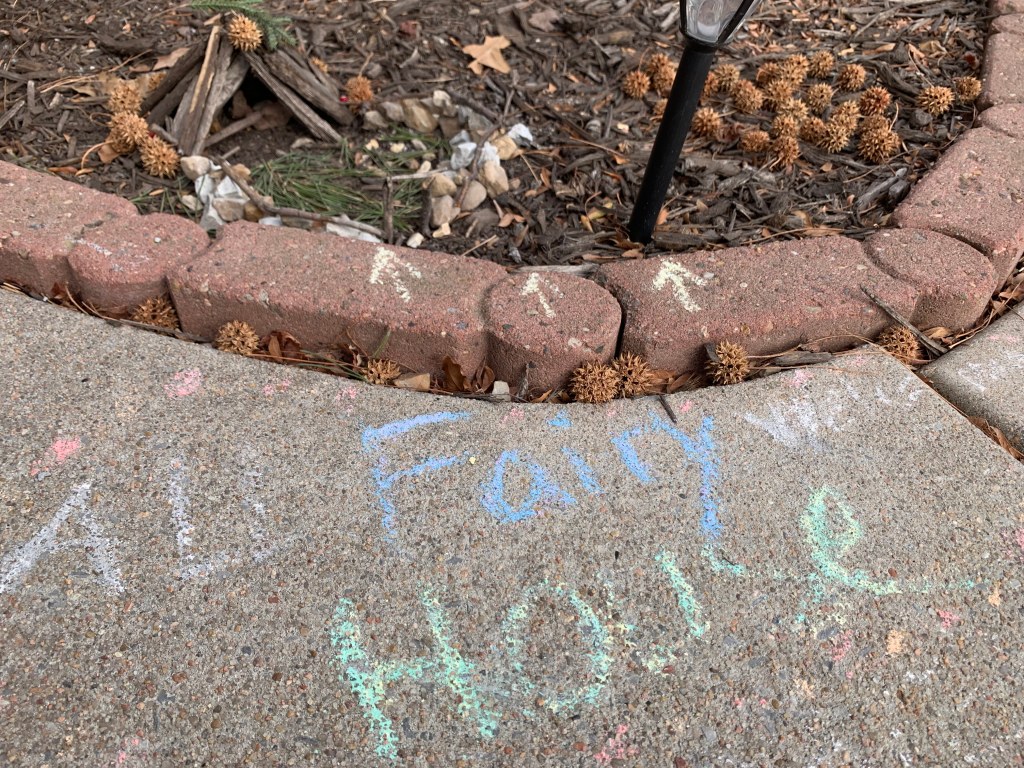 I found this little fairy house constructed in the corner of the front flower bed. The yard and flower beds look so dreary in the winter, missing all the green and blooms. They collect all the dead leaves and broken branches as well this time of year. But this little sanctuary in the dirt was the most delightful my flower bed has ever been. Not only was it intricately constructed, but the message penned in chalk brought so much warmth to my heart. “ALL fairies welcome”