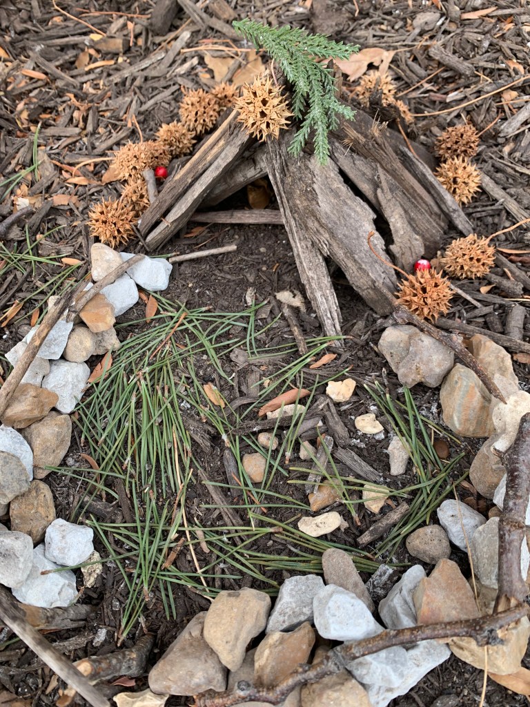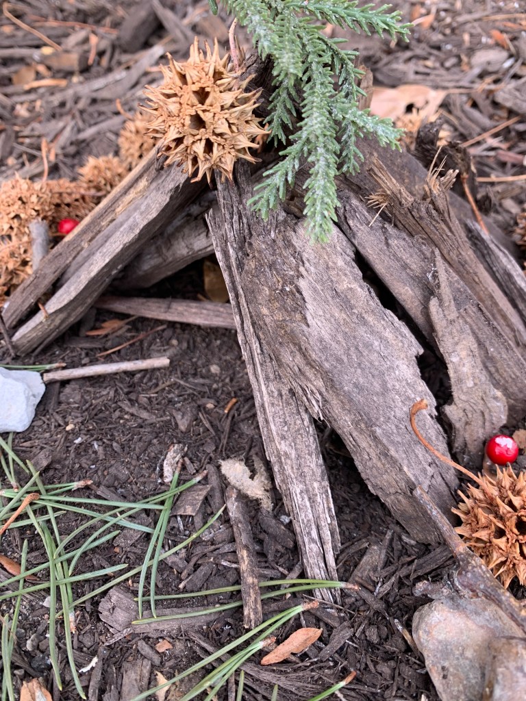 I wasn’t expecting today to be so impressed with mulch, sticks, rocks and those dreadful spiked pods, but the way God used the vessel of my little fairy house maker to bring JOY into this lackluster part of the yard, resulted in me not only being impressed, but filled with JOY.
